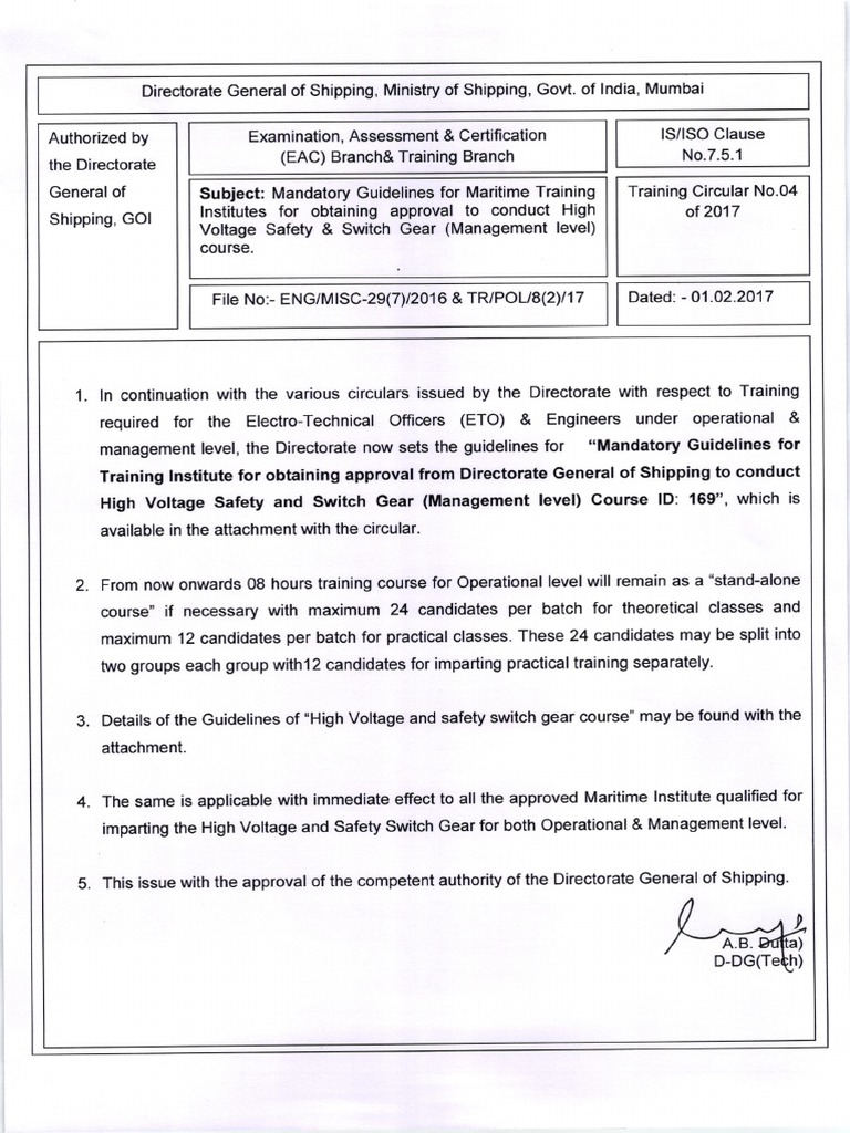 High voltage safety and switch gear courses approved by directorate general of shipping govt.